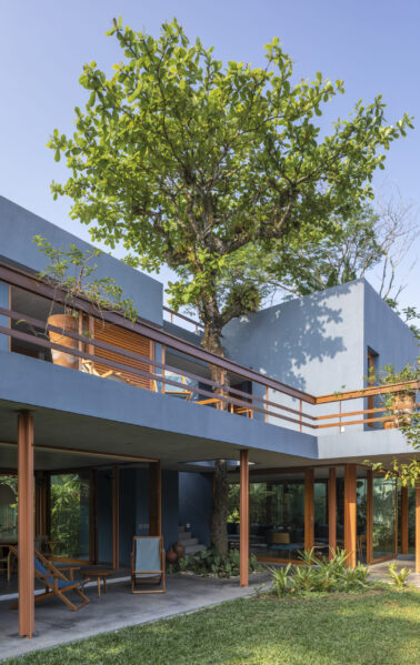 Uma dessas árvores, um chapéu de sol localizado no meio do lote e que atravessou os terraços do térreo e superior, tornou-se um elemento participante do construção. O volume resultante ocupou aproximadamente a metade do terreno – sentido rua/fundos – restando um considerável jardim ao longo da construção. Toda a casa, desta forma, se abre diretamente para ele.